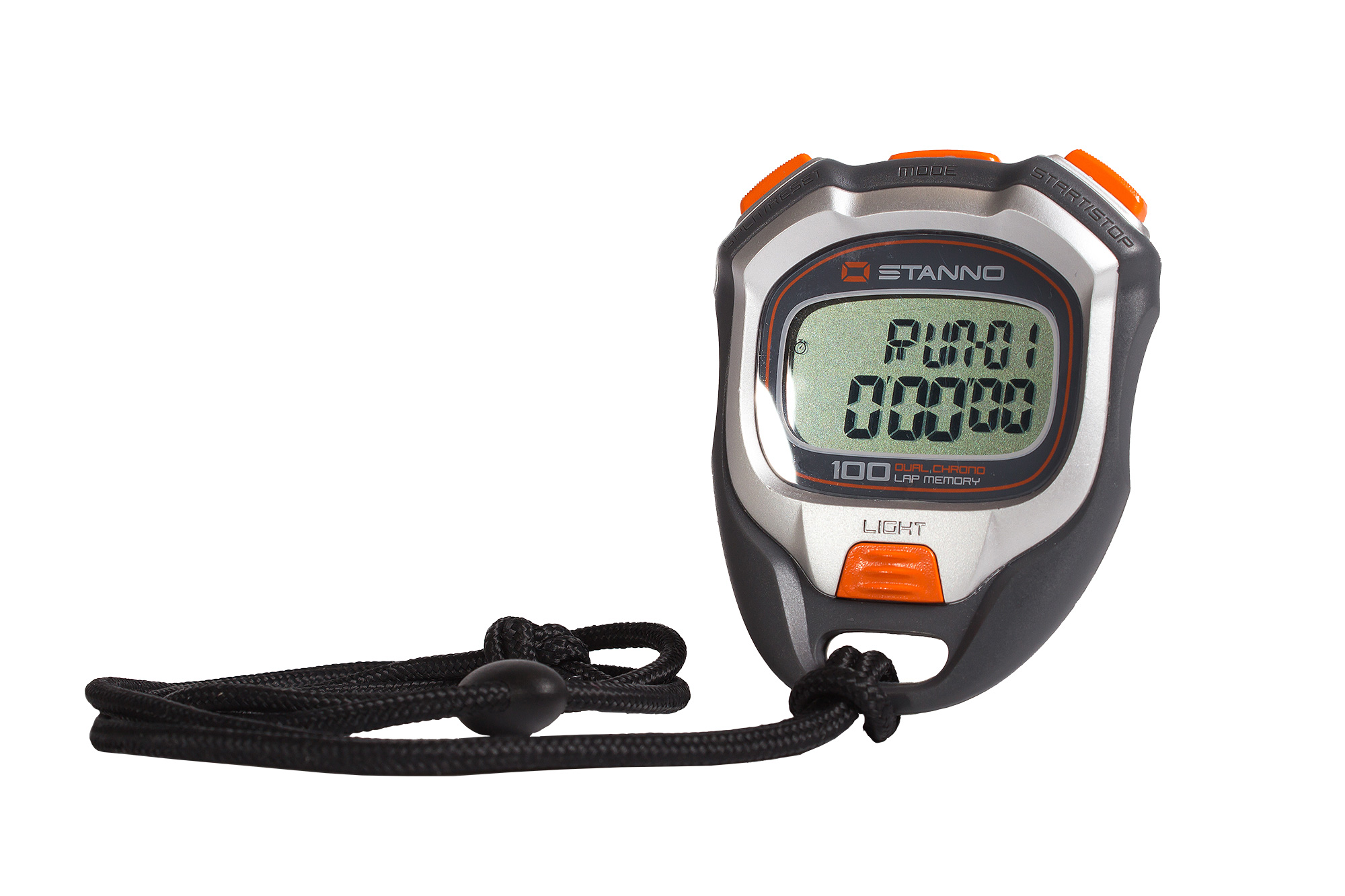 Diese professionelle Stoppuhr ist mit einem großen (23 mm), digitalen Display versehen. Präzise Anzeige in 1/100 Sekunden. Das Gehäuse ist aus stoßfestem, weichen Gummi und wasserdicht. Mit einem Speicher für 100 Rundenzeiten und Dual-Chrono Anzeige. Zwischenzeitenoption: Verwalten Sie Ihre eigenen Sport- und Ruhezeiten. Die Stoppuhr ist wasserdicht und mit Beleuchtung und praktischer Kordel versehen.
